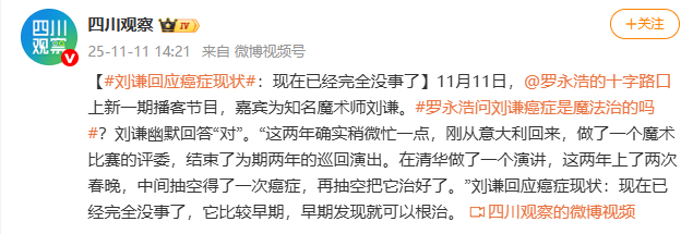 11月11日,@罗永浩的十字路口 上新一期播客节目,嘉宾为魔术师刘谦。罗永浩问刘谦癌症(肺腺癌)是魔法治的吗?刘谦幽默回答“对”。