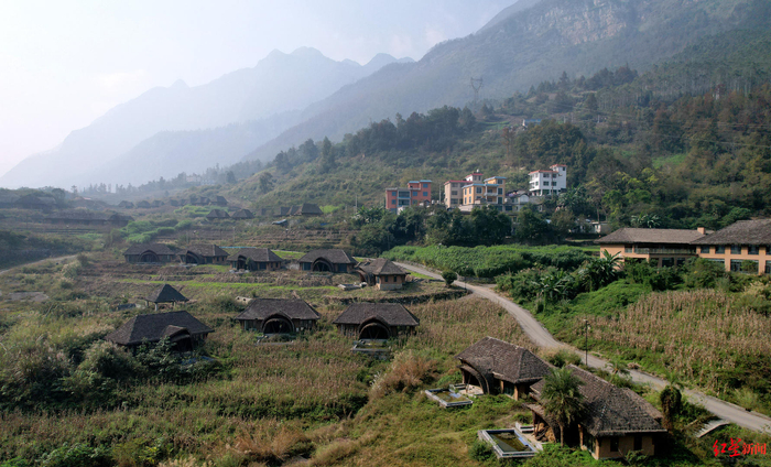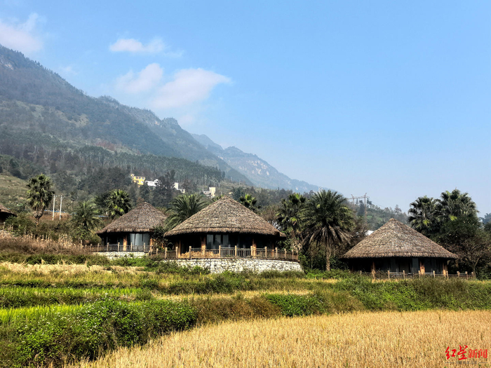 “稻田酒店”位于村里的河谷旁。12月1日,红星新闻记者来到现场发现,数十栋建筑错落分布,周围有梯田、民房等。其中大部分建筑已成型,完成了内部基装,另有部分建筑未完工。这些建筑设计别致,屋顶铺有茅草,不少房屋前还建有水池。但由于长时间无人打理,房屋周围杂草丛生,外墙及内部部分设施或装饰有破损。