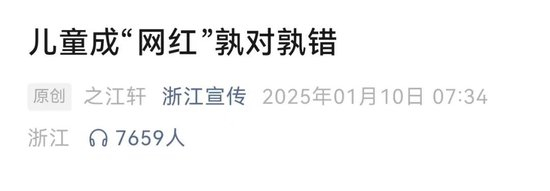 此前,对于儿童成“网红”的现象,浙江宣传曾发表评论指出,法律并未规定未成年人不能作为短视频作品的“主角”或参与者。家长适度“晒娃”,分享孩子日常生活,这本是无可厚非的事。但倘若过度“晒娃”,一味利用孩子牟利,甚至给孩子的身心造成危害,则必须加以治理。