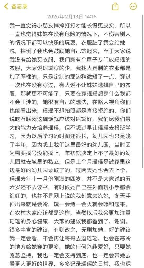 13日,“瑶一瑶小肉包”母亲在账号发布回应:“我一直觉得小朋友摔摔打打才能长得更皮实,所以一直也觉得妹妹在没有危险的情况下,不伤害别人的情况下都可以快乐的玩耍,大家的建议我都看到了,谢谢。很多中肯的建议,有则改之,无则加勉。如果我真的为了挣钱连孩子身心都不顾了,我一定会比现在挣得多十倍,但是从中衍生出来很多恶意造谣请立即停止,再次谢谢大家的关心!”