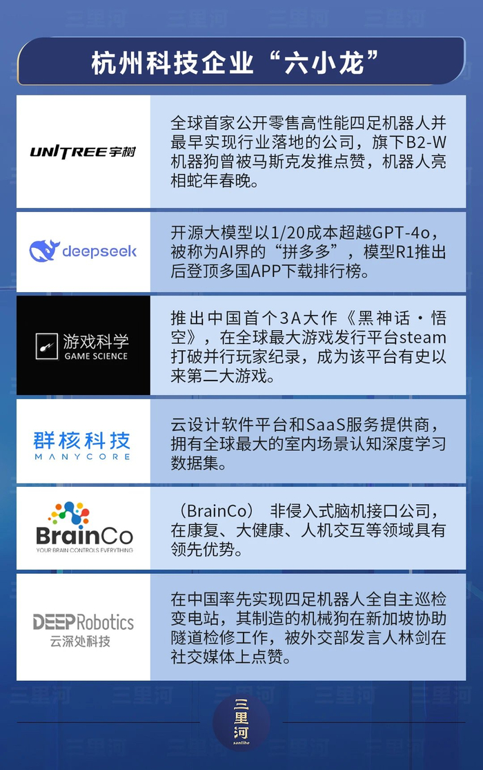 去年末今年初,以大模型公司深度求索(DeepSeek)为代表、被合称为“杭州六小龙”的6家“科技新贵”引起海内外关注,被称为“神秘的东方力量”,今年春节前后,它们的热度持续升温。