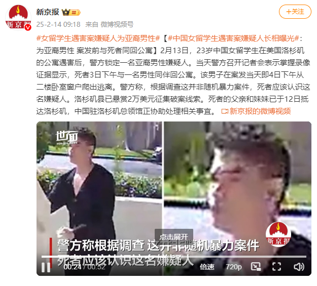2月13日,23岁中国女留学生在美国洛杉矶的公寓遇害后,警方锁定一名亚裔男性嫌疑人。当天警方召开记者会表示掌握录像证据显示,死者3日下午与一名男性同伴回公寓。该男子在案发当天即4日下午从二楼卧室窗户爬出逃离。警方称,根据调查这并非随机暴力案件,死者应该认识这名嫌疑人。洛杉矶县已悬赏2万美元征集破案线索。死者的父亲和妹妹已于12日抵达洛杉矶,中国驻洛杉矶总领馆正协助处理相关事宜。