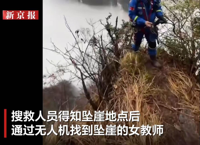 另据新京报我们视频报道,有知情人称,坠崖者系一名女性教师,事发悬崖有200多米深,搜救人员得知坠崖地点后,通过无人机找到坠崖的女教师。搜救人员用绳子滑下悬崖,找到女教师时,她已无生命体征。